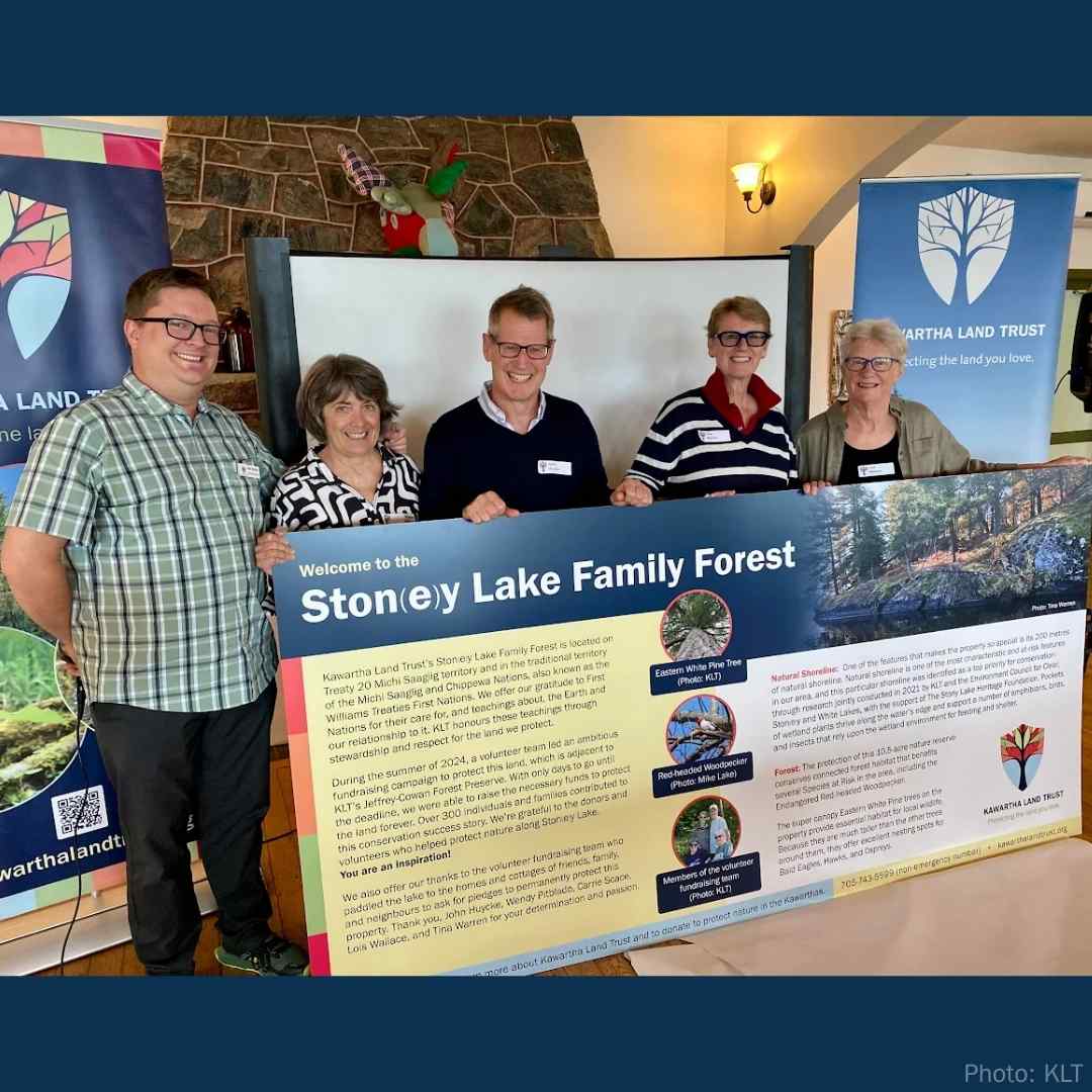 Through the successful conservation of KLT’s Christie Bentham Wetland, est. 2020, and Ston(e)y Lake Family Forest, est. 2024, the respective volunteer fundraising teams ensured the combined protection of over 1,850 feet of natural, undisturbed shoreline and almost 150 acres of nature in Peterborough County.